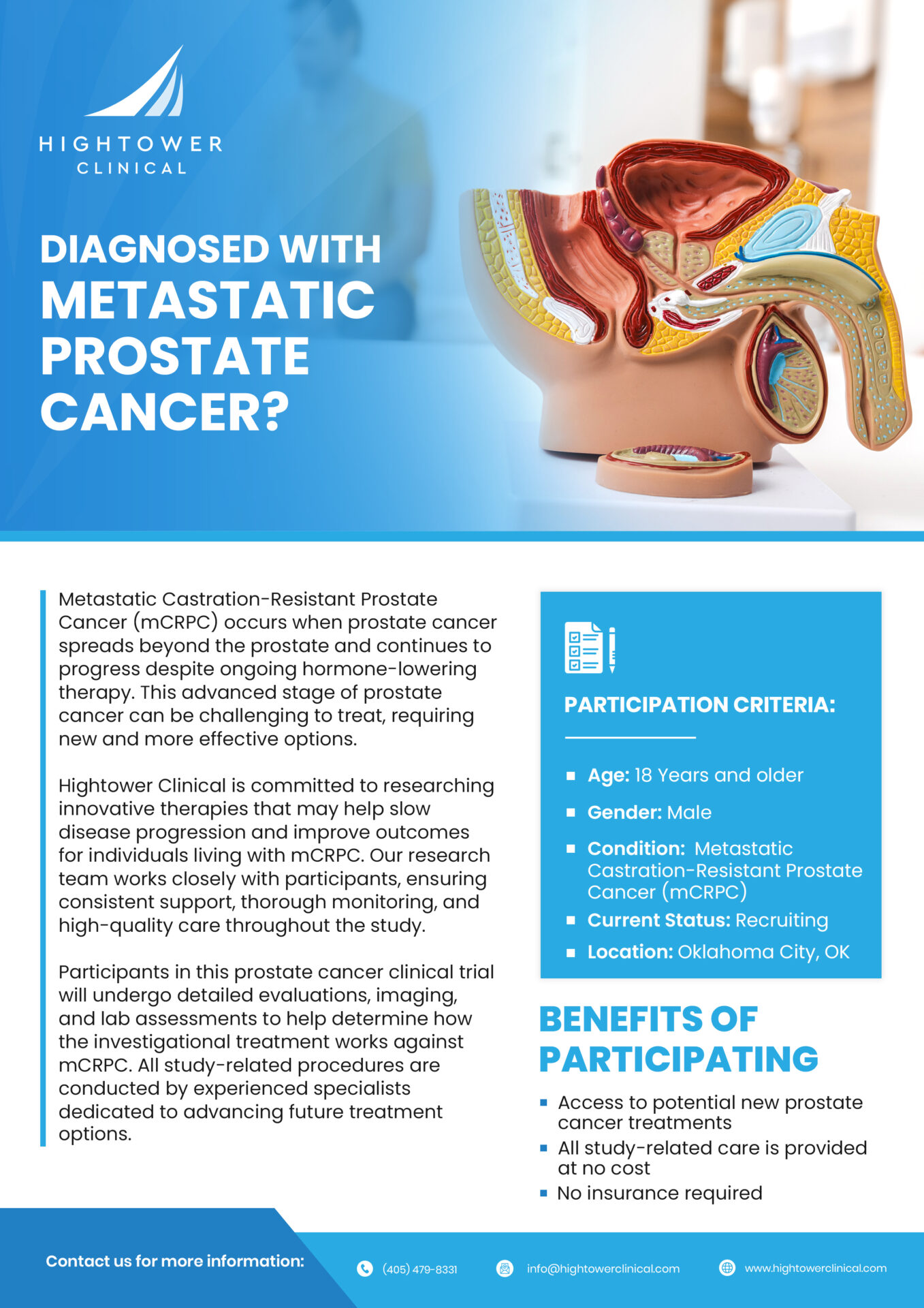 Hightower Clinical is enrolling participants for a research study evaluating an investigational treatment combination designed for adults with chemotherapy-naïve mCRPC. The goal is to explore whether this new approach may help control disease progression and offer another option for patients who have limited alternatives.