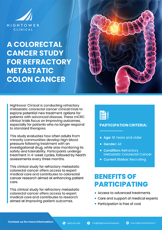Hightower Clinical is conducting refractory metastatic colorectal cancer clinical trials to study how often high blood pressure occurs during treatment in minority groups.