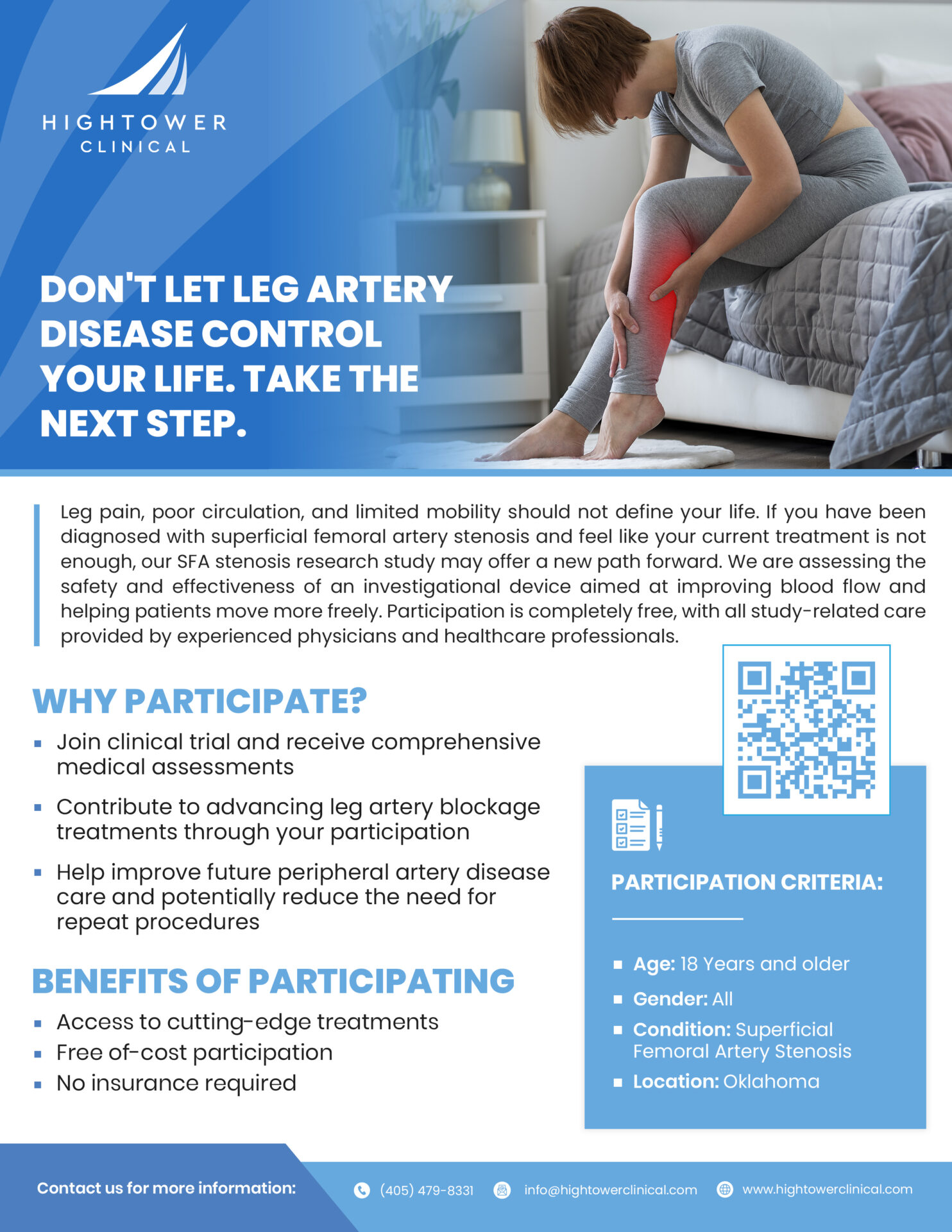 At Hightower Clinical, we are currently conducting a leg artery blockage clinical study to assess the safety and effectiveness of an investigational device designed for individuals living with superficial femoral artery stenosis.
