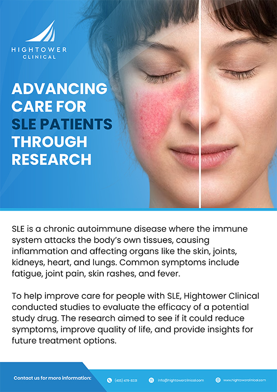 Hightower Clinical conducted studies to evaluate a new investigational therapy for patients with SLE who had already received standard care. The trials aimed to explore whether this therapy could help improve SLE symptoms and overall quality of life, while also contributing to a better understanding of the disease and potential future treatment options.