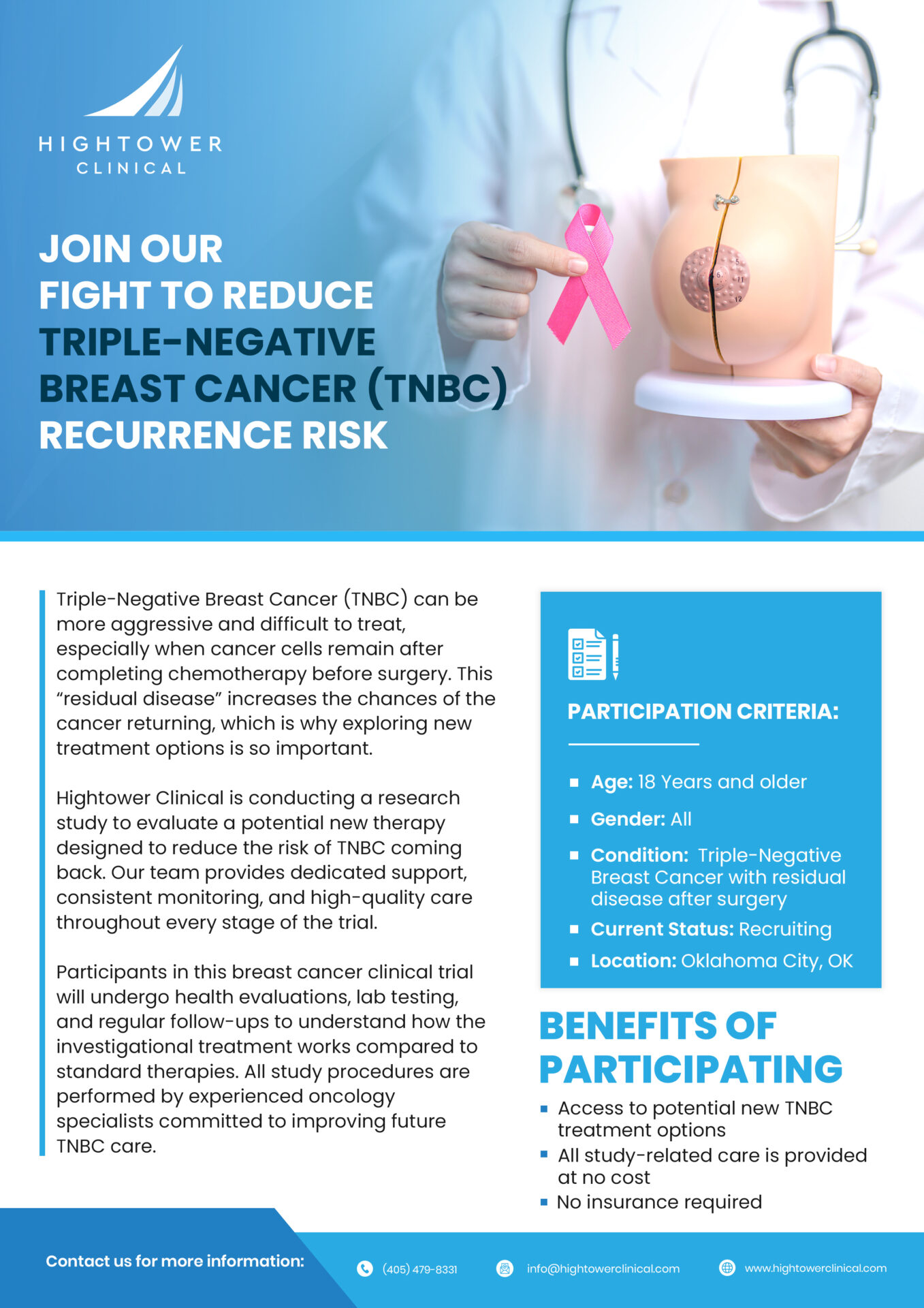 In partnership with leading oncology researchers, Hightower Clinical is running a Phase 3, randomized, open-label study for people with triple-negative breast cancer who received chemotherapy before their surgery but did not achieve a complete response (meaning some cancer remained).